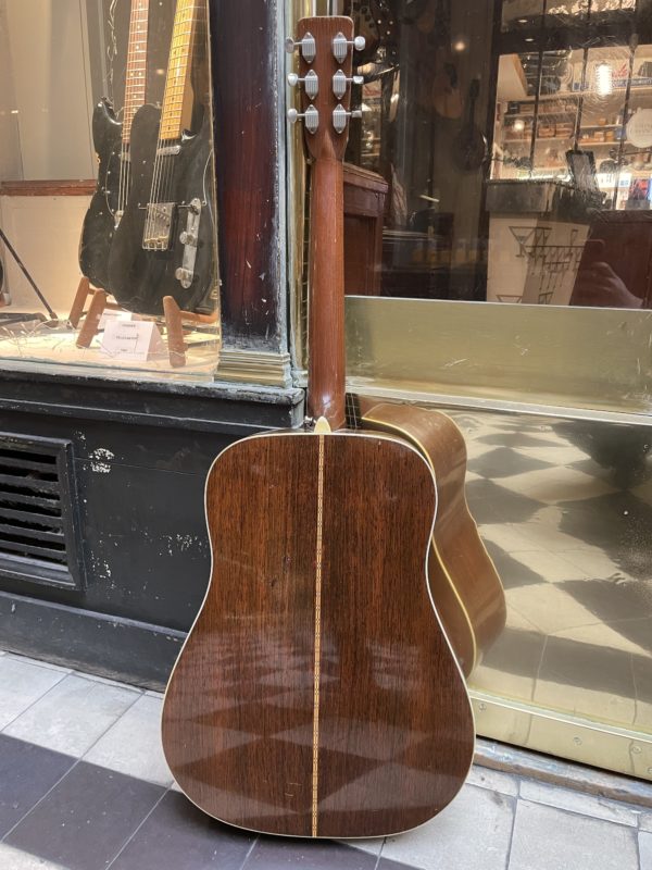 Cet exemplaire est l’un des 911 D-28 vendues en 1957 au prix non négligeable de 270 $ (sans étui). Il présente les caractéristiques typiques de l’époque : binding noir et blanc en celluloïd multi-pli sur le pourtour du fond et de la table ; un chevalet belly bridge en ébène à sillet traversant ; une touche en ébène incrustée de repères en nacre ; un pickguard en celluloïd tortoise ; un jeu de mécaniques Kluson. Il présente un magnifique fond en palissandre de Rio à grain droit allié à une table en épicéa à grain serré et régulier – ces deux essences seraient considérées comme du bois de première qualité de nos jours ; le manche en acajou est relativement fin et confortable avec un léger profil en « V ».
