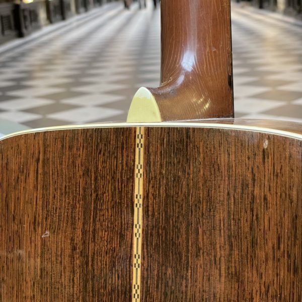 Comme toutes les guitares acoustiques d’un certain âge, et bien qu’elle soit superbement conservée, cette D-28 nécessitait un travail conséquent afin de lui restituer l’intégralité de ses qualités d’instrument de musique, ce à quoi nous nous sommes appliqués dans notre atelier. Afin de récupérer une action idéale et un bon appui des cordes sur le sillet de chevalet nous avons effectué un neck reset : décoller le manche pour réajuster son angle par rapport au plan de la table avant de le recoller dans la bonne position. Cette opération particulièrement délicate s’avère essentielle si l’on entend pouvoir jouer d’un instrument de musique ancien avec confort et justesse, sans en modifier les parties composantes qui sont essentiels dans la production du son, tels que le chevalet, le barrage ou la bridge plate. Une fois le neck reset effectué, la guitare est refrettée pour rétablir de façon parfaitement uniforme la base de jeu que sont les frettes ; enfin, un nouveau jeu de sillets en os est fabriqué et ajusté sur l’instrument, permettant d’obtenir une action basse et confortable et une intonation juste. Nous retrouvons ainsi une guitare dotée d’une excellente, jouabilité comme au jour où elle a quitté la ligne de production à Nazareth ! Outre un overspray ancien appliqué sur l’ensemble de l’instrument, cette D-28 sexagénaire demeure parfaitement intègre avec l’ensemble de ses parties principales d’origine – un témoignage de l’Âge d’or de la guitare flat-top américaine.