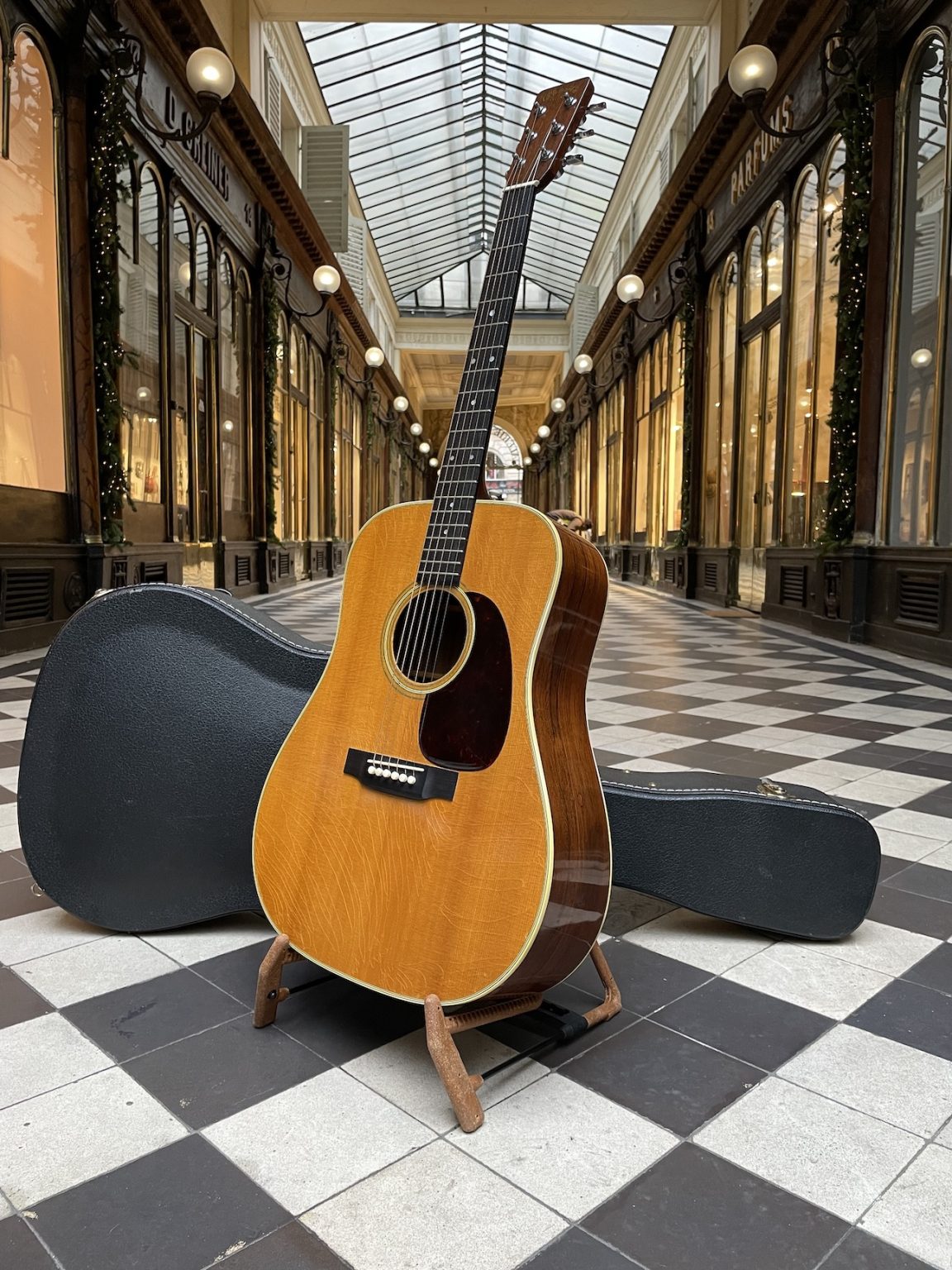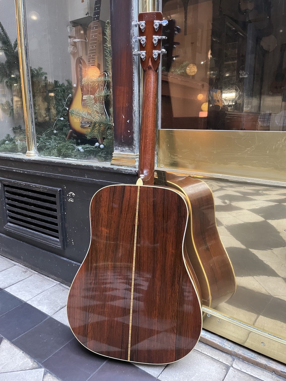 Modèle quintessentiel du format dreadnought, cette guitare nous vient du milieu des années 60, début de la période où la production de Martin connaît une expansion fulgurante – à titre d’exemple, 1827 exemplaires de D-28 sont produit pour l’année 1966, contre 928 pour l’année précédente et 2330 la suivante. En revanche, la qualité et le soin du travail engagé dans la construction de cet instrument n’ont nullement pâti de cette intensification de la production, si bien que cette D-28 n’a rien à envier à ses prédécesseurs du début des années 60 : une fourniture en palissandre de Rio sur le fond et les éclisses d’une beauté à tomber par terre, la table en épicéa magnifique parée d’un vernis fin et joliment faïencé, ses mécaniques Grover Rotomatic Pat. Pend. d’origine, le binding élaboré et le joint de fond marqueté… tant de caractéristiques qui font de ce modèle une véritable et intemporelle icône de la guitare folk.