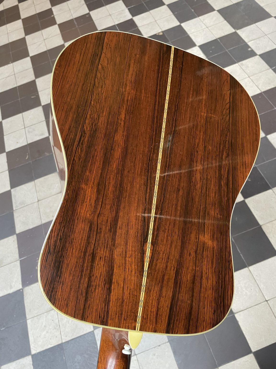 Cette guitare a pour elle d’avoir été épargnée par les coups et les marques qui affectent généralement les tables de Martin d’un certain âge. Neck reset récemment réalisé, l’appui des cordes sur le sillet de chevalet est donc idéal pour une projection et une force sonore maximales. Préparé et réglé par nos soins, prêt au jeu.