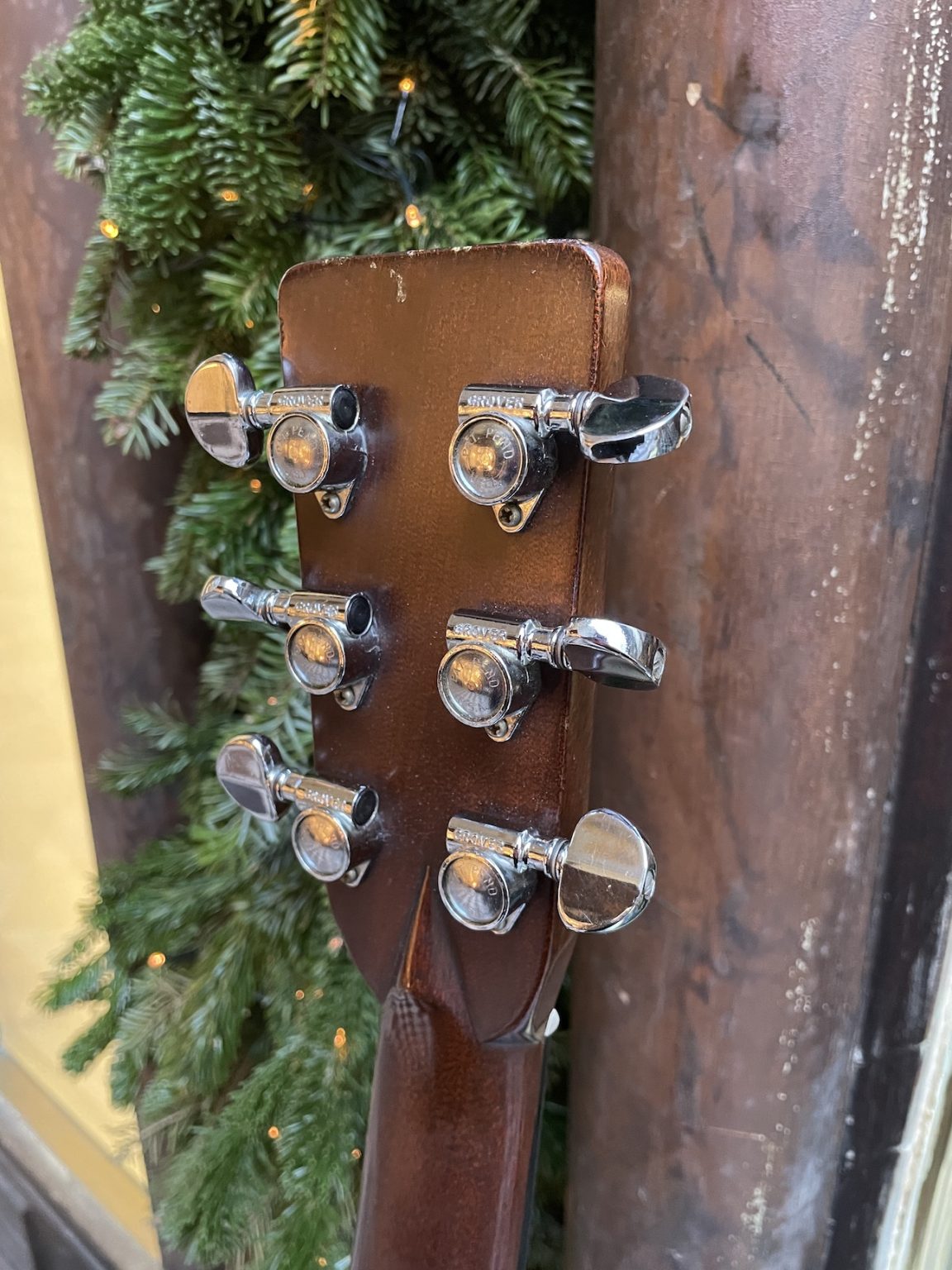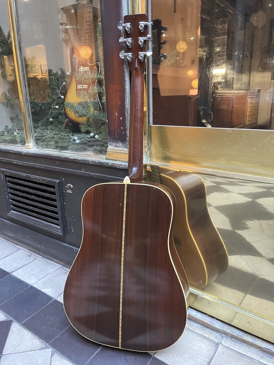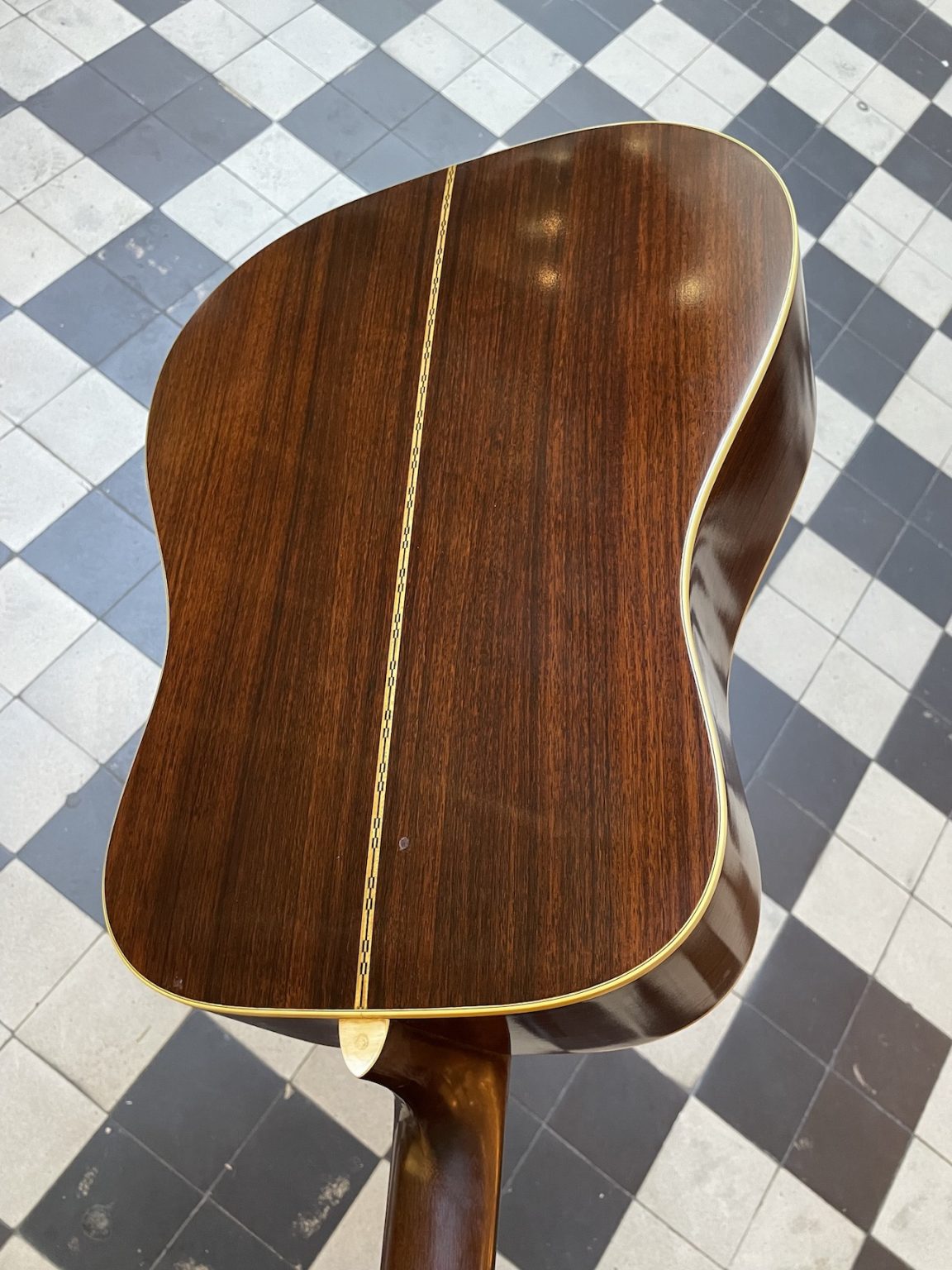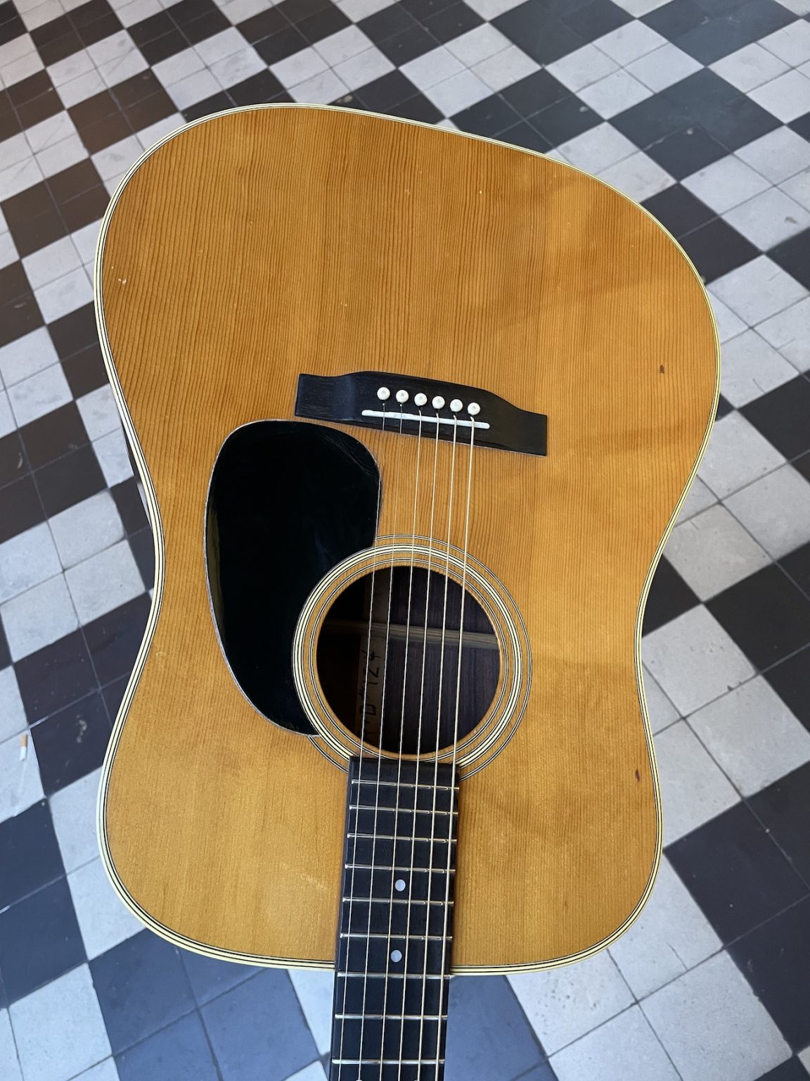 Cette guitare est énigmatique à bien des égards. Sa nature et sa provenance ne font aucun doute – elle est fabriquée dans les règles de l’art selon Martin, à savoir une fourniture en bois de grande qualité et un travail de lutherie et de finition précis, le tout absolument conforme à une D-28 du début des années 70, avec la plaque en acétate noir collée directement sur la bois, les mécaniques Grover “Pat. Pend.”, le renforcement vertical des éclisses en toile, la bridge plate, le fond et les éclisses en palissandre indien – cependant, quelques points particuliers sont à noter.